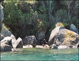 Vor der Küste liegt eine kleine Insel, die von Robben besiedelt wird und die wir als erstes angepaddelt haben. Vier Robben waren gerade im Wasser als wir uns der Insel näherten und – neugierig wie Robben eben sind – schwammen sie gleich auf uns zu und zeigten uns ihre Wasserkunststücke direkt neben den Kajaks! Da Robben ja meine Lieblingstiere sind, war ich vollkommen im Glück!